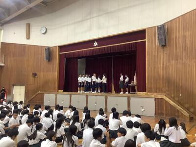 剣道部とソフトボール部の表彰があった後、今週末にある体育大会の応援についての説明が生徒会の方からありました。